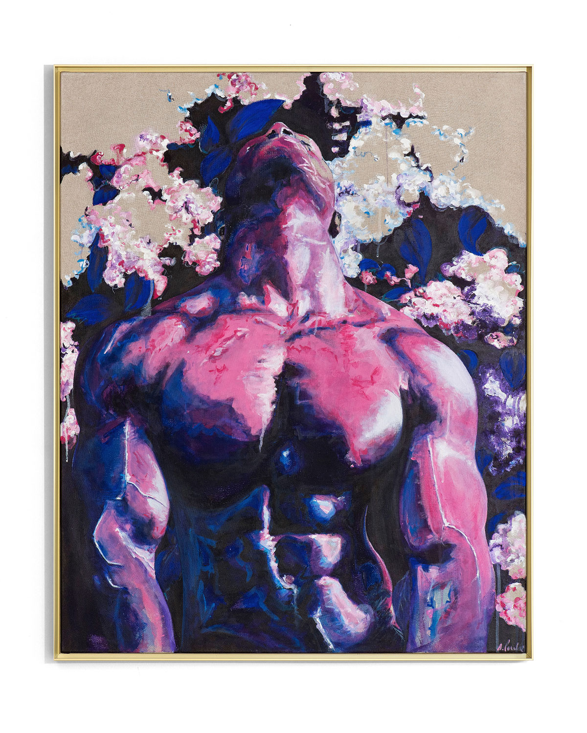 Sans souhaiter que le corps ne soit plus qu’un prétexte à gestes, formes, couleurs, et que la peinture ne le surpasse pour révéler un paysage, un paysage dans lequel on se perdrait pour se trouver – la nature c’est avant tout le corps humain #jesuisvivant -, je questionne autant l’architecture de la surface que celle de l’anatomie. Le corps se charpente comme une multitude d’espaces singuliers : un paysage déconstruit et reconstruit où se confrontent les bleus et les roses. L’homosexualité en rose et bleue, en écho aux stéréotypes de genre, mais également à l’homosexualité « noire » (celle de Genet, de Pasolini, de Mapplethorpe) qui se confrontait à l’homosexualité « blanche » (facile, quotidienne, visible, diurne) telles que définies par Guy Hocquenghem en 1975 . En sortant de cette confrontation binaire, les couleurs s’offrent en camaïeu. La toile de coton brute accueille tout, et réserve des espaces de respiration. Le corps, à la fois figuré et oublié, appelle à une forme d’abstraction du sujet. Mais comment représenter un corps abstrait ? Qu’est-ce que serait l’abstraction des corps, sinon l’image du souvenir ?